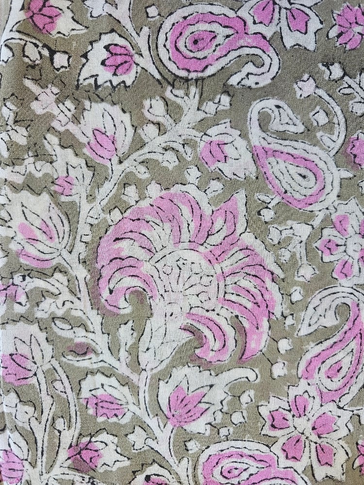 Tissu indien en coton avec un fond mastic avec des fleurs roses.